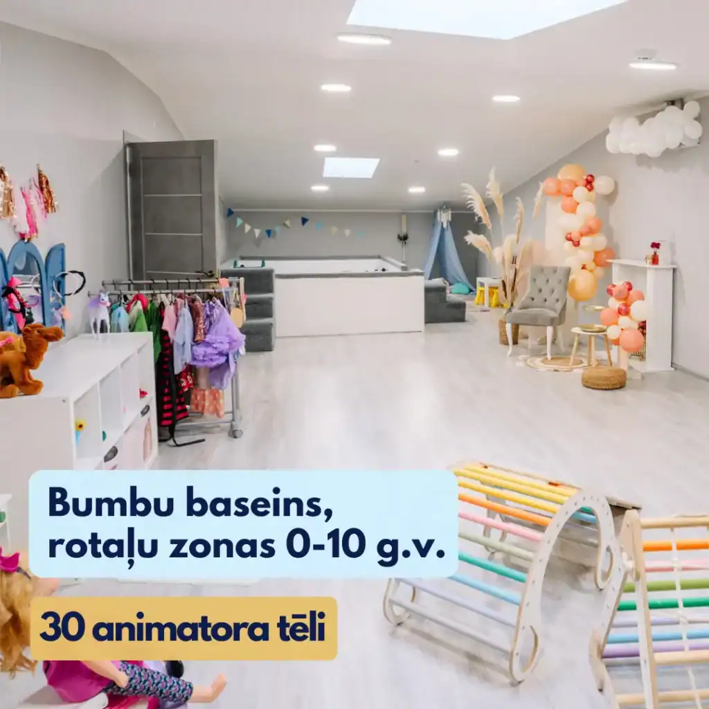 Telpas iespējams pielāgot arī pieaugušo svinībām ar bērniem atvēlētu rotaļu zonu ap bumbu baseinu.