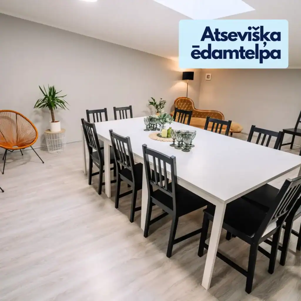 Kopā atpūtai pieejamas 2 atpūtas telpas 90 kv. m. platībā ar iespēju atsevišķā telpā nodalīt ēdamzonu vai citas aktivitātes